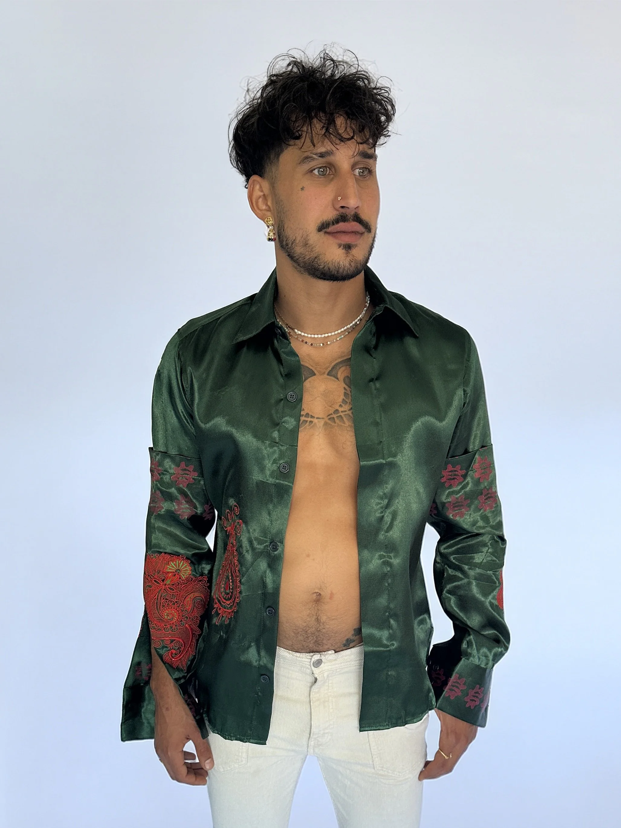 The AZAADI for Them shirt is a tapestry of resistance and beauty, weaving together Bangladeshi Nakshi Kantha, Palestinian Tatreez, and Mexican Huichol embroidery— each stitch honoring ancestral craftsmanship and survival. At its heart is artwork by a trans Iranian artist whose bold re-imagining of Persian miniatures queers tradition and defies patriarchy. Their work reclaims erased histories of feminist and queer existence, transforming censored images into portraits of collective joy, rebellion, and freedom. Together, the textile traditions and visual art form a unified language—one that speaks of shared struggle across borders, of gender defiance, of cultural pride.This shirt is not just worn; it’s carried as a declaration of AZAADI— freedom for all.